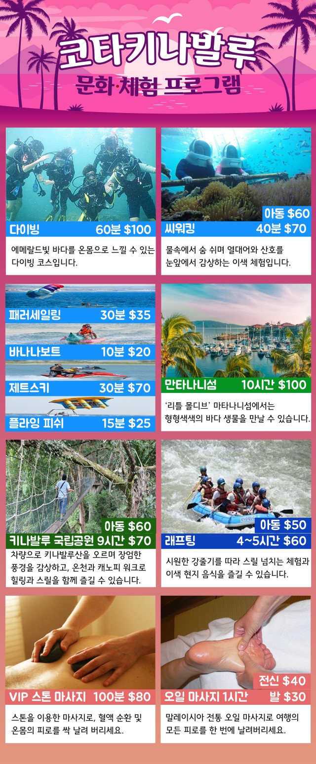 | ⭕ 포함사항 왕복 항공권, 유류할증료 및 택스, 숙소, 일정상 차량, 일정상 식사, 호핑투어, 코타키나발루 시내관광, 1억원여행자보험 ❌불포함사항 가이드 및 기사 팁 1인 $30(3박), 1인 $40(4박) ※ 제외 : 밍가든, 그랜드인 3박/4박/ 1인 $50 동일, 관광세 10링깃 (룸/박당), 일정상 불포함된 식사, 선택관광, 에티켓 팁 및 기타 개인 경비, |