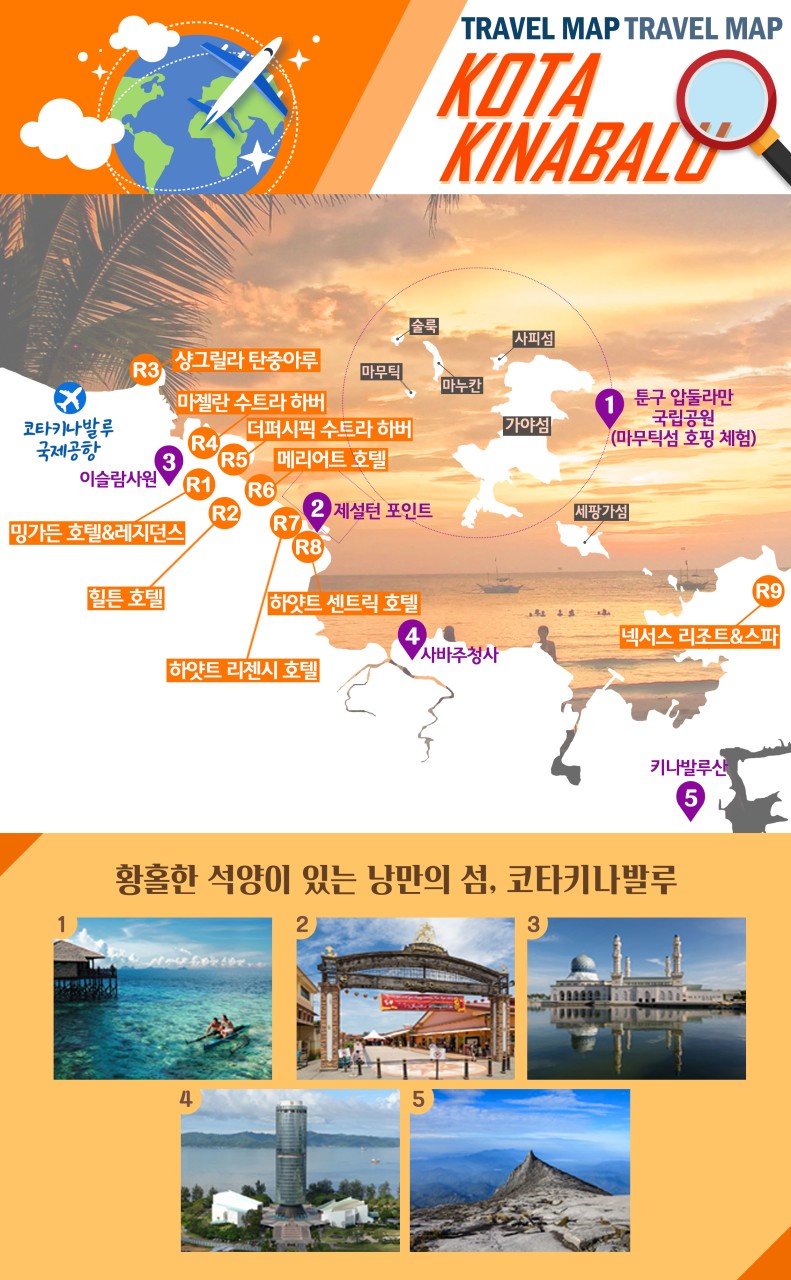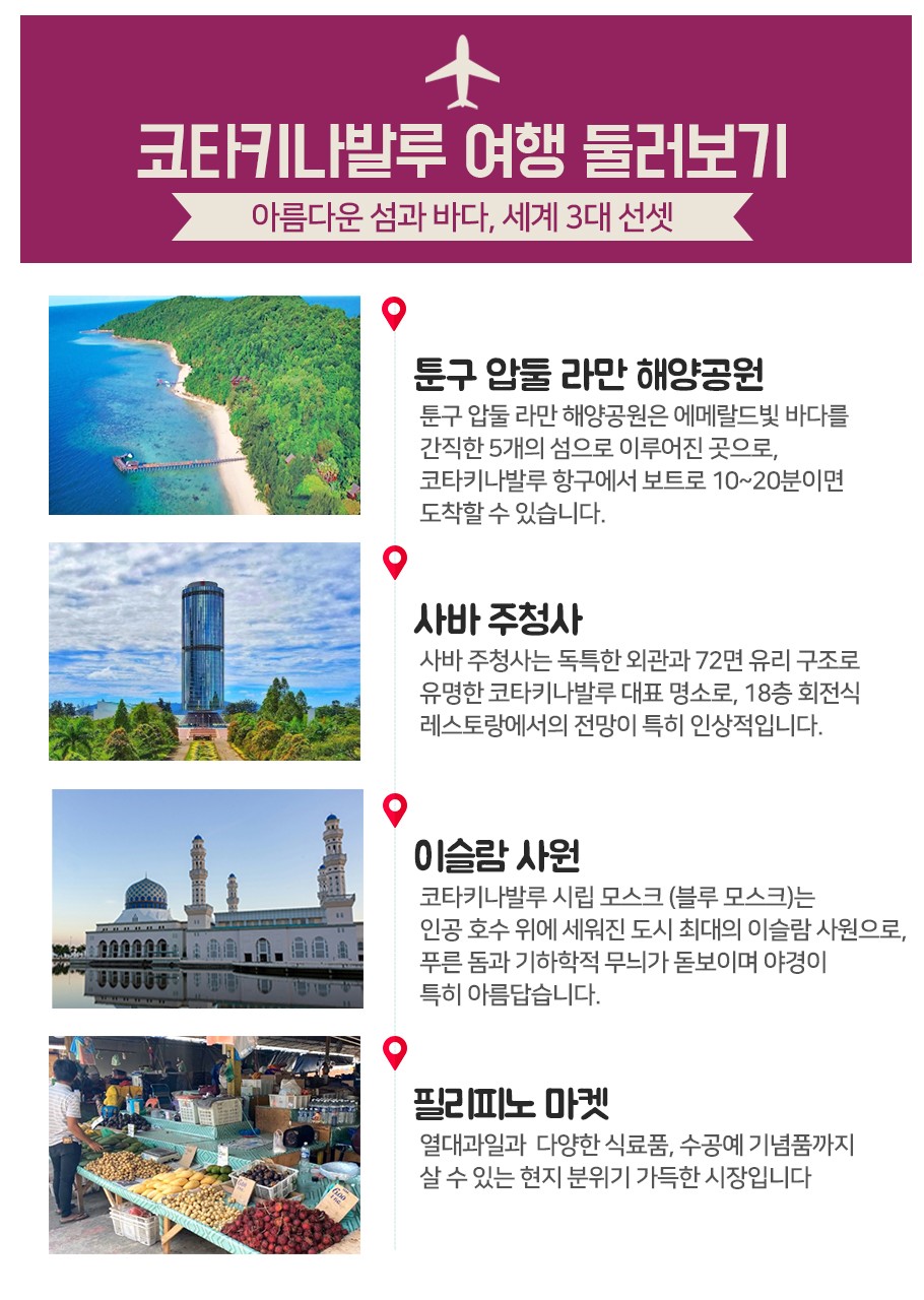 | 📌 상품 포인트 🧡 시내와 접근성이 편리한 가성비 4성 밍가든호텔 기준 💛 툰구 압둘라만 국립공원 호핑투어 포함 💚 코타키나발루 시내관광 (제설턴포인트, 이슬람사원, 사바주청사) 💙 코타키나발루 나이트투어 (야시장투어+코코넛음료 시음) |