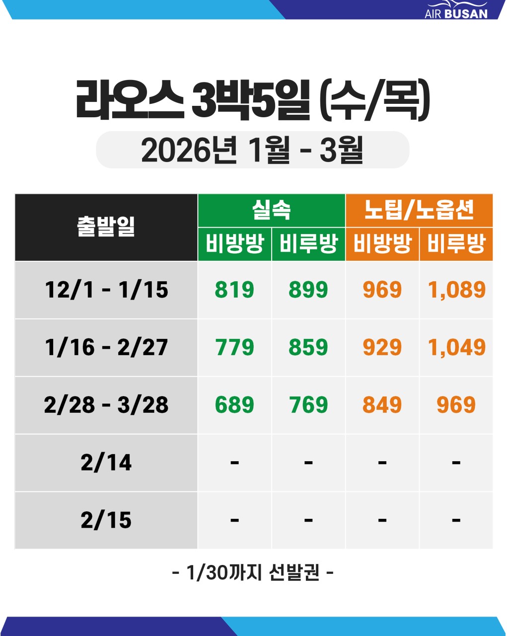 ✅ 1월 30일 까지 선발권 조건입니다/ 발권후 취소시 항공 환불 수수료 1인 15만원 발생됩니다.