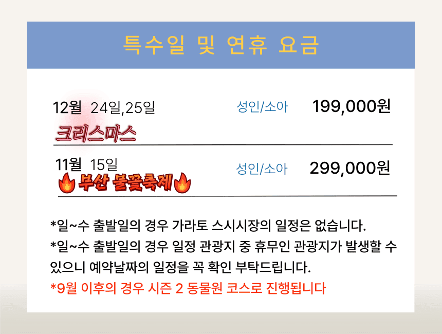| 11월 22일(1호차) | 동물원 코스+선상불꽃놀이 | 출발확정/마감 |