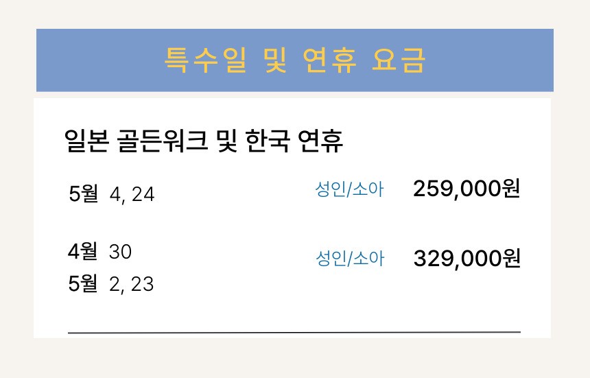 *3월 4일, 3월 8일, 5월 24일 출발 일정의 경우, 일본 기준 평일에 해당하여