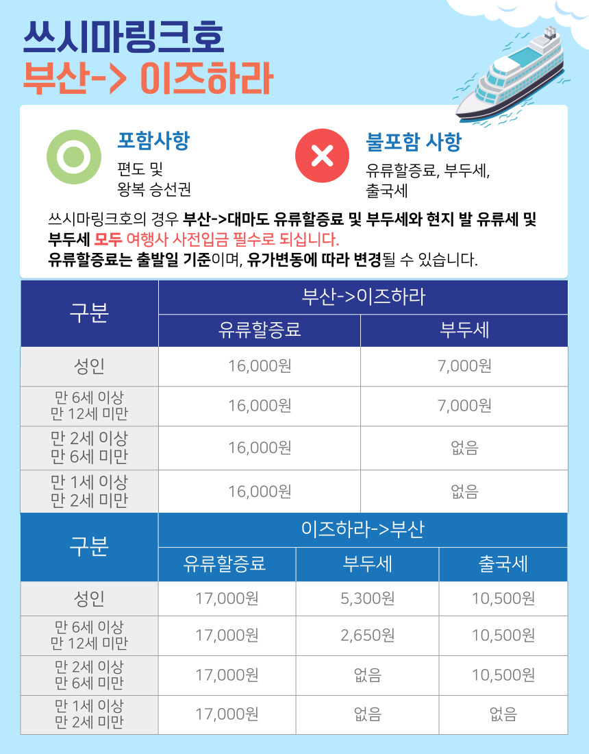 ❌ 불포함사항 | 왕복 유류 할증료, 부두세, 일본 출국세 |