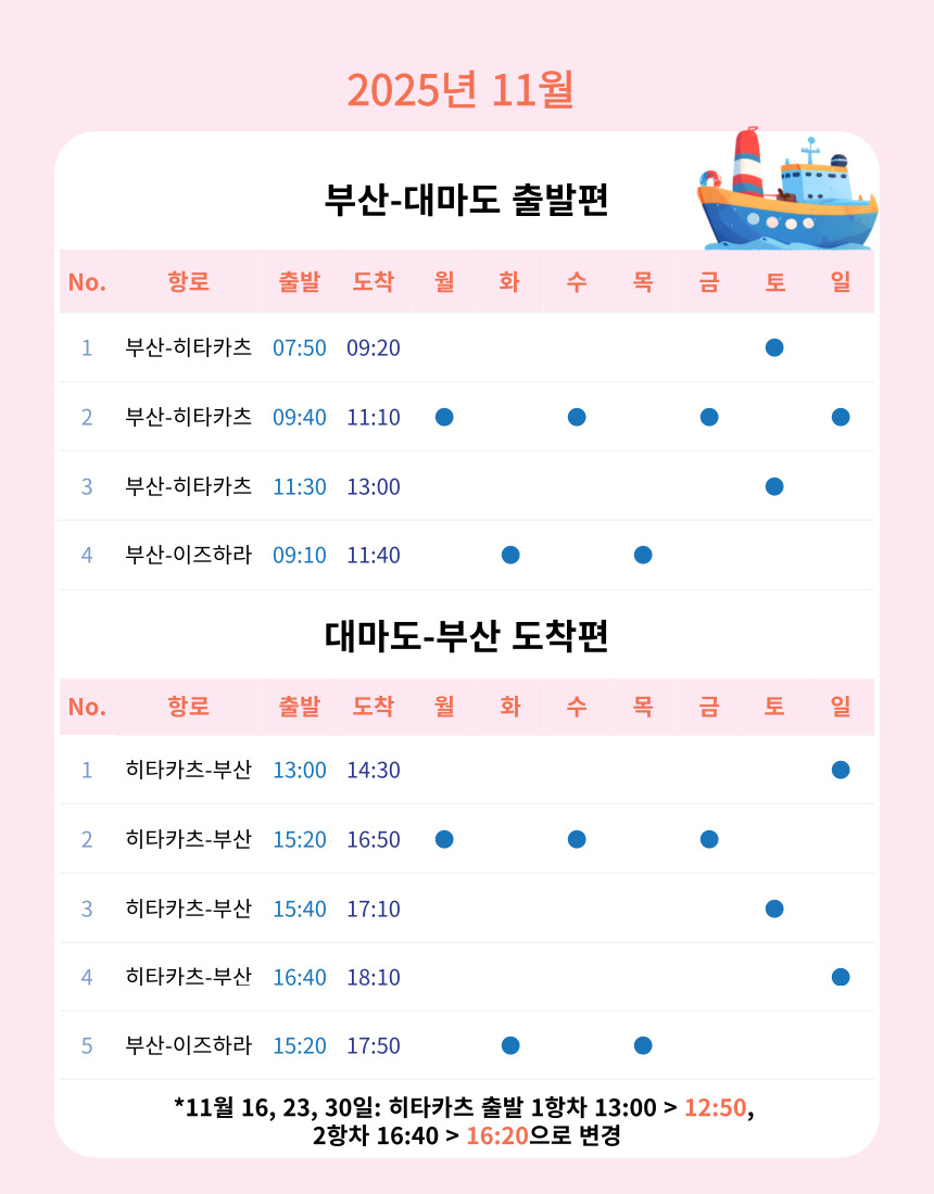 이즈하라 >부산 귀국편 운항시간 변경됩니다