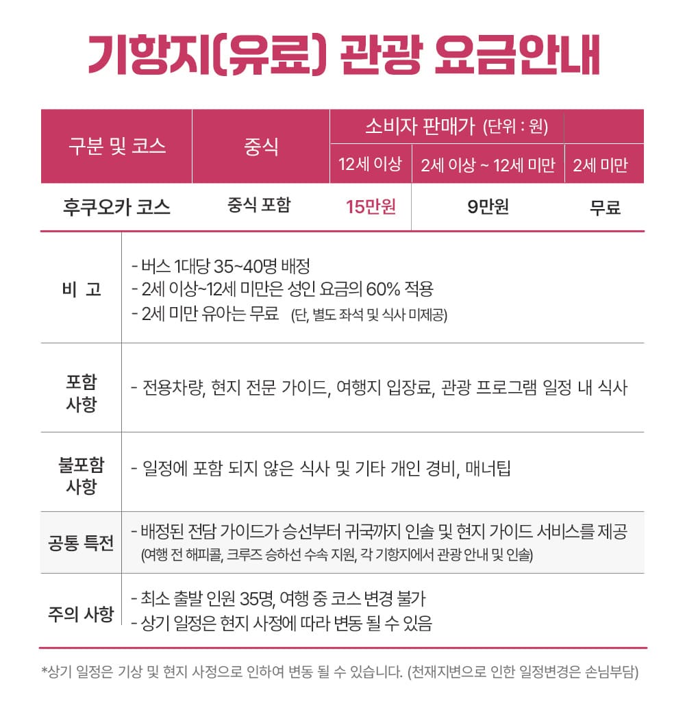 X 불포함 사항 | 선택관광 - 현지 기항지 관광 선상팁(스탠다드,스테이트,디럭스 1인당1박당 $16,스위트,로얄스위트 1인당 1박당$18 ) ,여행자보험,일본국제 관광여객세$7.5 (당인 환율에 따라 선내 개별결제) 선내 개인 지출비용(유료 레스토랑 및 주류,음료구입,유료시설 이용시 비용 발생) |