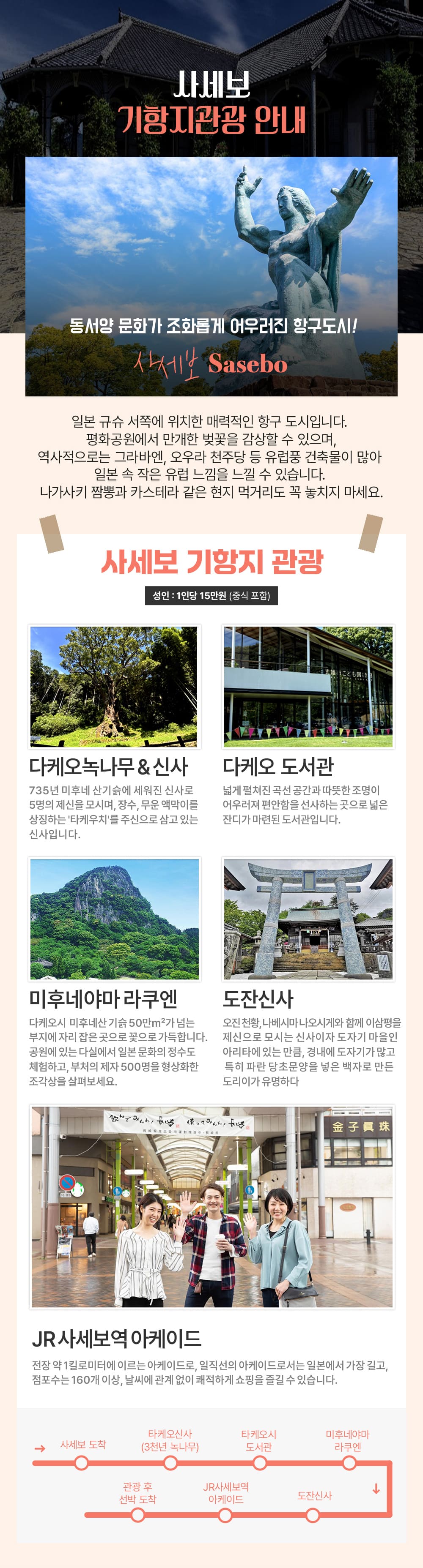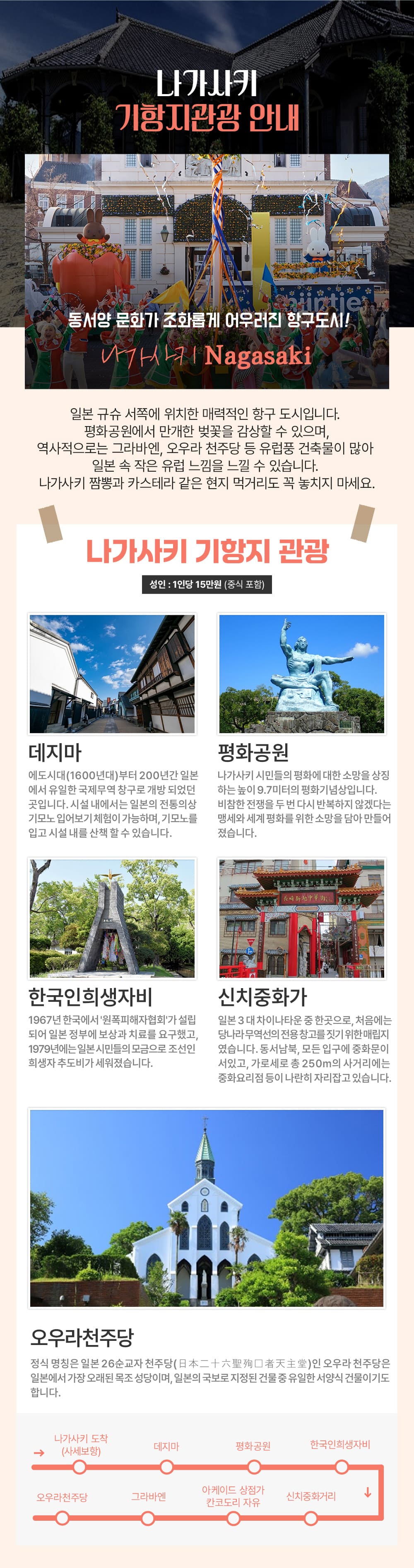 | 3일차 | 08:00 (기항지 투어 이용료 별도 >> 1인당 15만원 추가 ) ▶ 바다와 문화가 어우러진 도시 나가사키 관광 - 평화공원,한국인희생자비,데지마 -신치중화가,칸코도오리,그라바엔,오우라천주당 18:00 항구로 이동 크루즈 승선 및 출항 |