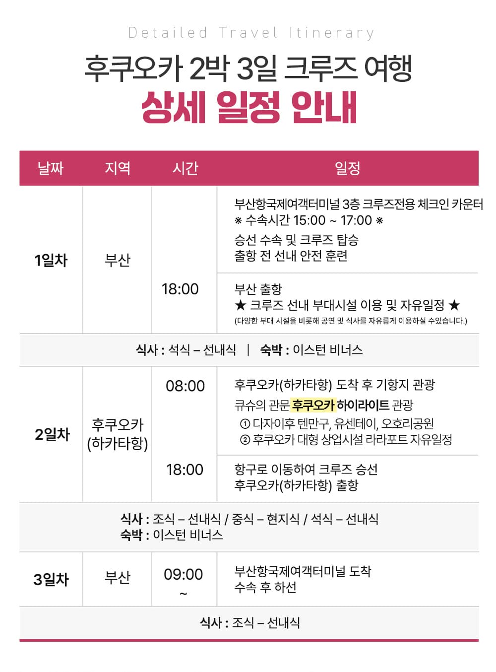 | 1일차 | 15:00 부산 국제여객터미널 3층 크루즈 전용 체크인 카운터 집결 :※ 수속시간 15:00- 17:00 ※ 승선 수속 및 크루즈 탑승 출항 전 선내 안전 훈련 18:00 부산 출항 크루즈 선내 부대시설 이용 및 자유일정 (다양한 무대시설을 비롯해 공연 및 식사를 자유롭게 이용하실 수 있습니다.) 식사 - 석식 : 선내식 숙박 : 이스턴 비너스 |