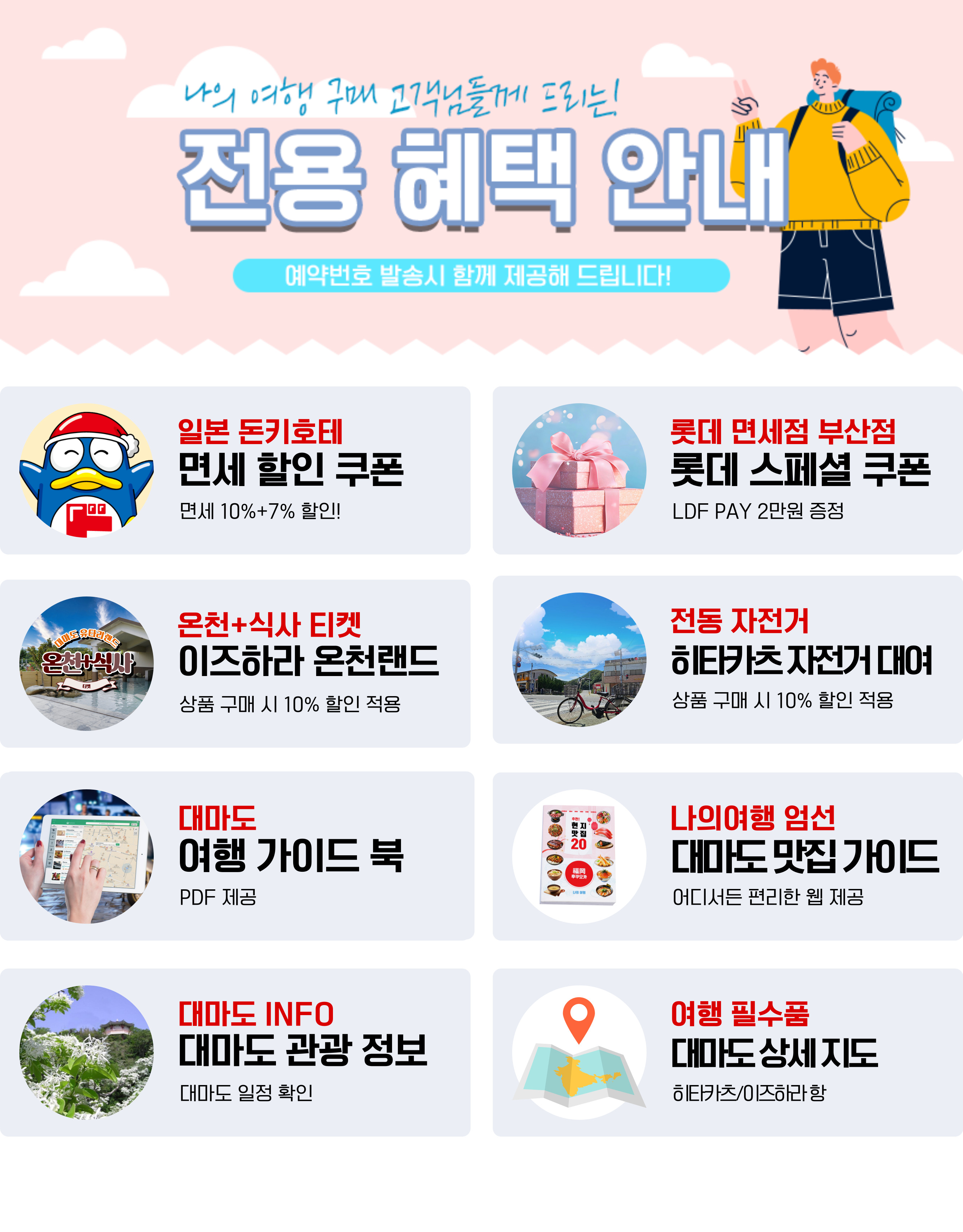 1일차 | 06:40 부산 국제여객터미널 3층 집결 08:40 부산국제여객터미널 출발 -팬스타 쓰시마링크 11:40(예정시간) 대마도 이즈하라항 도착 및 입국 수속 ▶ 대마도주의 거처 금석성 터 ▶조선의 마지막 옹주 ‘덕혜옹주’의 결혼을 축하하기 위해 세운 덕혜옹주 결혼봉축비 ▶ 대마도의 대표적 신사 하치만구 신사 ▶ 춘향전을 일본에 소개한 ‘나카라이토스이’의 문학관 체크인 후 자유 석식 자유시간 식사 - 중식:현지식 / 석식:자유식(1천엔지급) |