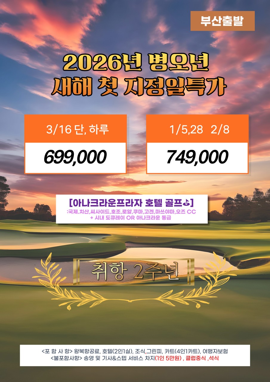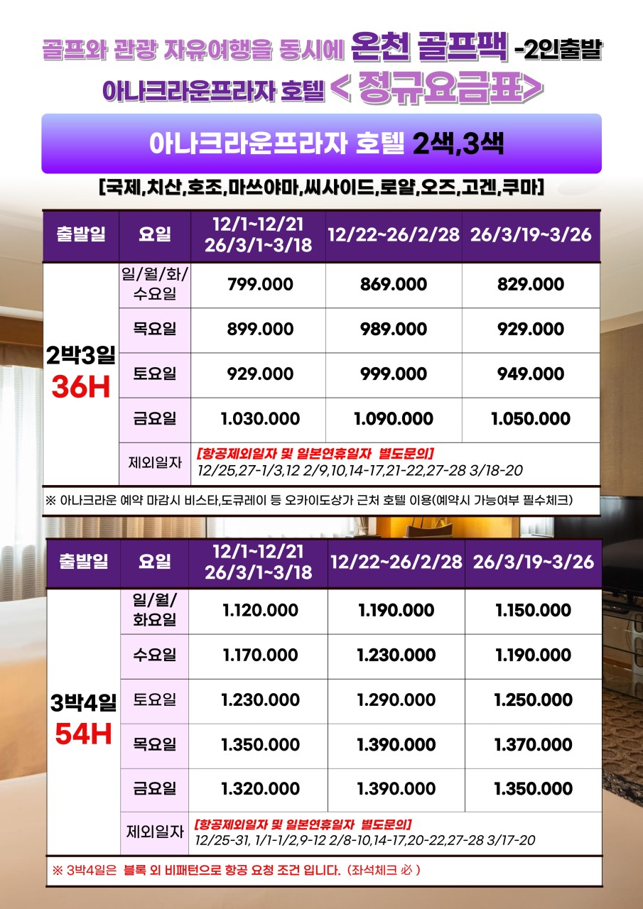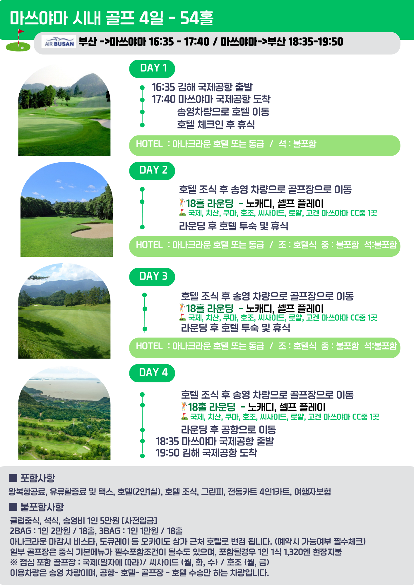 ✅ 호텔 및 골프장은 현지 사정에 따라 수배 가능한 곳으로 지정됩니다.