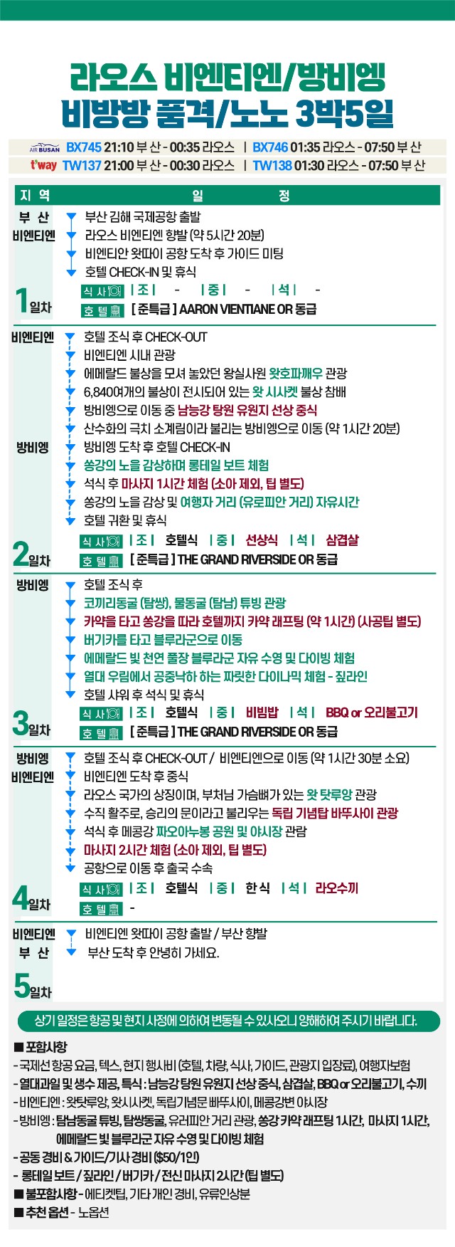 | 🌟 수, 목 출발 - 3박 5일 🌟 📌 실속 비방방 상품 포인트 비엔티엔+방비엥 ->방비엥에서 엑티비티 즐기기 노팁! 노옵션! -> 부담없이 즐기는 여행 ① 전 일정 준특급 호텔 🏨 ② 전신 마사지 1시간 포함 (팁별도)👍 ③ 방비엥의 꽃, 블루라군에서 수영 및 다이빙 🤿 ④ 쏭강에서 $30상당의 카약 레프팅 포함 (2인 1대 탑승) 🛶 ⑤ 탐쌍 동굴 관광 & 탐남 동굴 튜빙 체험 ✨ ⑥ $180 상당의 풀옵션!! 롱테일보트/ 짚라인/ 버기카/ 전신마사지 2시간 (팁별도)👍 ⑦ 가이드/ 기사팁 포함 ($50상당) 📌 실속 비루방 상품 포인트 비엔티엔 + 방비엥 + 루앙프라방 → 열차이용 새벽탁발 노팁! 노옵션! -> 부담없이 즐기는 여행 ① 전 일정 준특급 호텔 🏨 ② 전신 마사지 1시간 포함 (팁별도)👍 ③ 방비엥의 꽃, 블루라군에서 수영 및 다이빙 🤿 ④ 쏭강에서 $30상당의 카약 레프팅 포함 (2인 1대 탑승) 🛶 ⑤ 탐쌍 동굴 관광 & 탐남 동굴 튜빙 체험 ✨ ⑥ 방비엥 -> 루앙프라방 이동시 고속열차 탑승 🚅 ⑦ 꽝시폭포(삼림욕), 탁밧행렬참관 🏞️ ⑧ $180 상당의 풀옵션!! 롱테일보트/ 짚라인/ 버기카/ 전신마사지 2시간 (팁별도)👍 ⑨가이드/ 기사팁 포함 ($50상당) 🧡 특전 ① 룸당 과일 도시락 1개 제공 ② 아마존 커피 1인 1잔 제공 ③ 마지막날 석식 라오스 현지식-> 로얄키친 또는 그린페퍼 레스토랑 업그레이드 ④ 방비엥 뷰바 맥주 1병 또는 음료 1캔 제공 🔔 예약 전 필수 체크 사항 1. 에어부산(BX) 부모 비동반 소아규정 안내(만 14세 미만) ★ 변경 : 부모 비동반 시 공증 받은 영문 부모 동의서와, 영문 주민등록 등본 OR 가족 관계증명서 필수 └ 부모 동반 없이 할아버지 할머니랑 같이 미성년자만 입국 시 또한 부모동의서 공증 필요 ※ 만 14세 미만 미성년 동반 고객께서는 해당 서류 필수로 지참하실 수 있도록 안내 부탁드립니다. 2.여유사증면 관련 사항 - 여권 잔여페이지 3페이지 이상 남아 있어야 할것 3. 전자담배 반입 불가 |