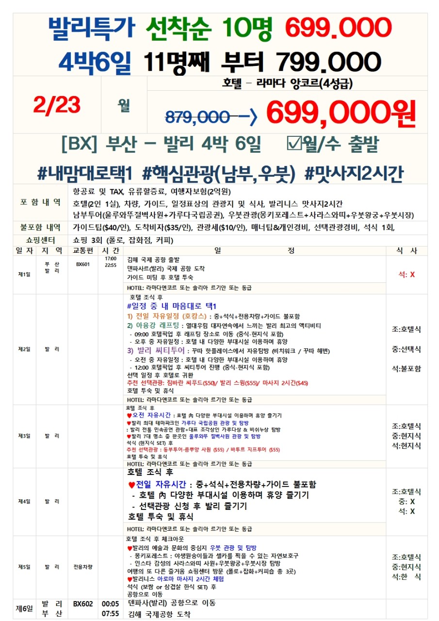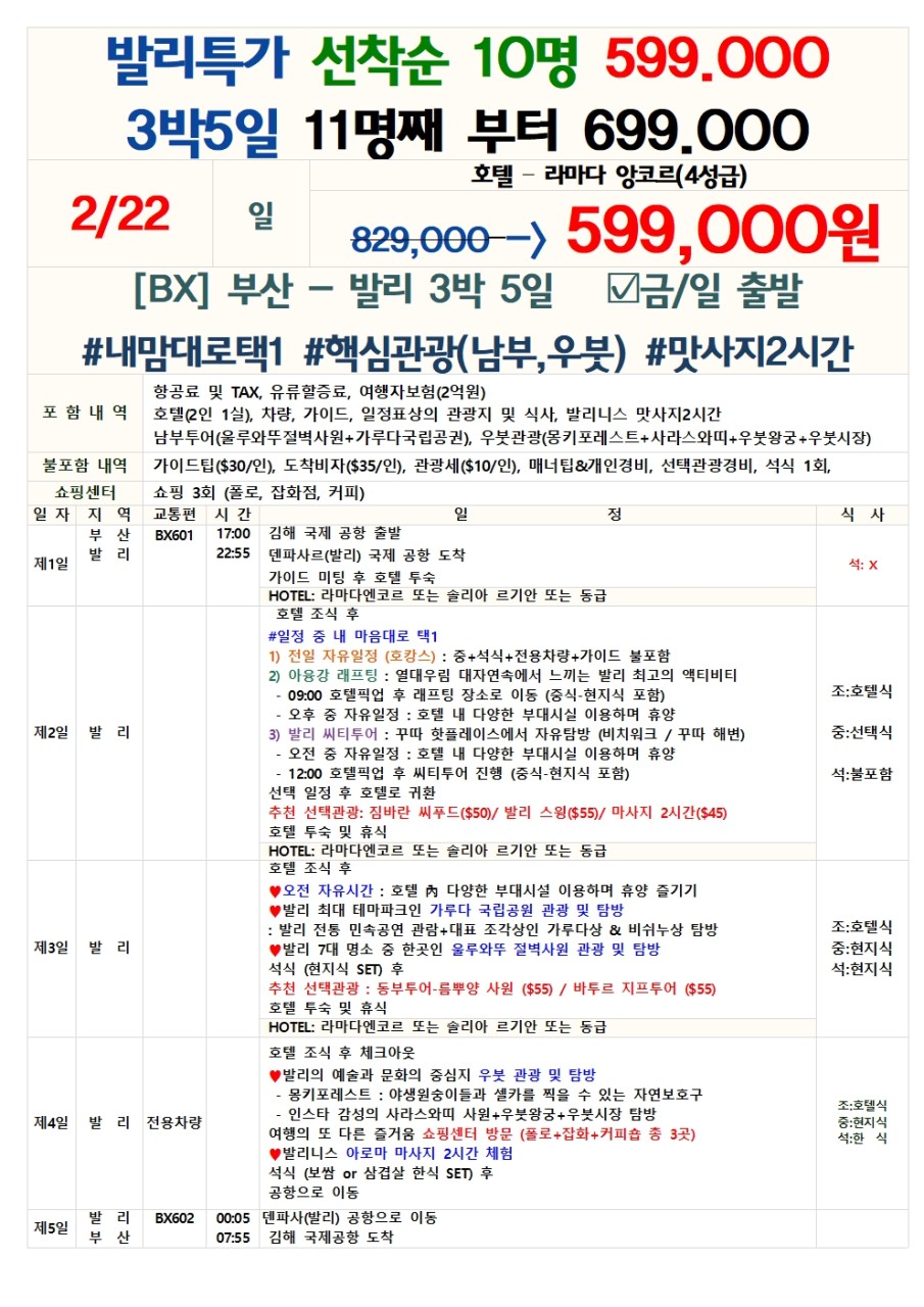 | ⭕ 포함사항 왕복 항공권, 유류할증료 및 택스, 숙소, 전일정 차량, 일정표상 식사, 맛사지 2시간, 남부투어(울루와뚜절벽사원+가루다국립공원), 우붓관광(몽키프레스트+사라스와띠+우붓왕궁+우붓시장), 1억원 여행자보험 ❌불포함사항 가이드 및 기사팁 ($30/5일, $40/6일), 도착비자 $35/인 +관광세$10/인, 선택관광, 에티켓 팁 및 기타 개인 경비, |