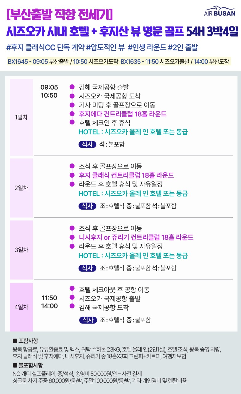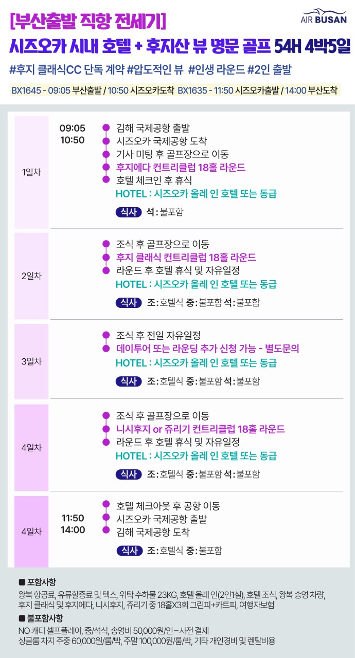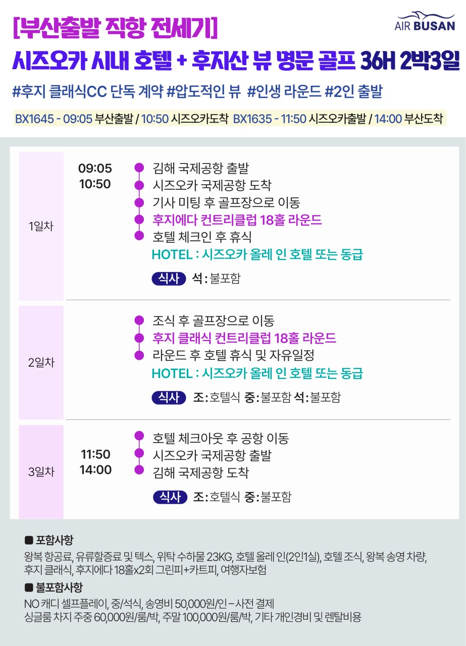 [부산출발 - 에어부산] 시즈오카 시내숙박 골프 3일 36홀 또는 4일 54홀 #후지산뷰 #후지클래식 #후지에다 #온천호텔MD