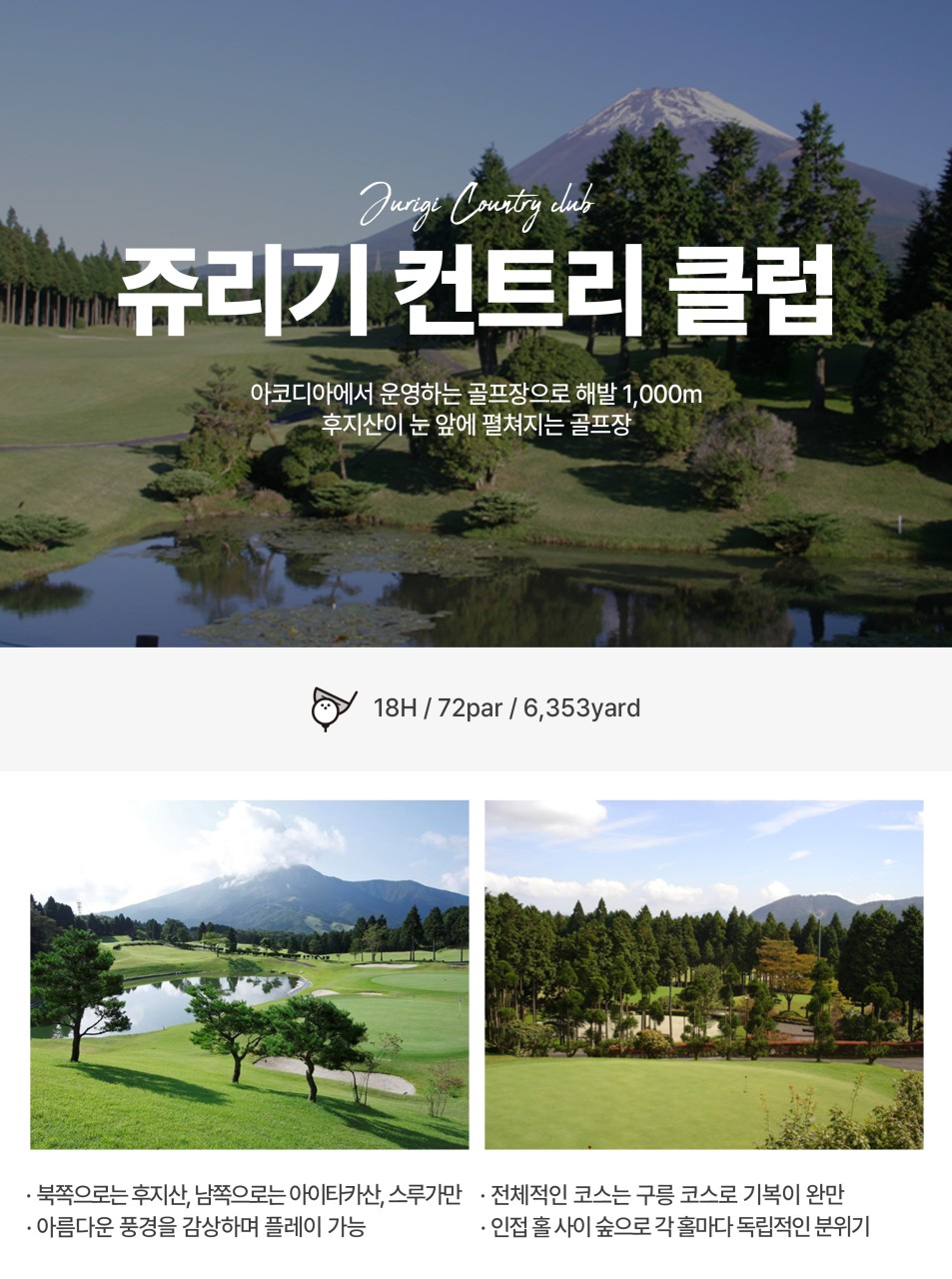 - 해발 1,200m 고원 지대에서 웅장한 후지산을 감상하며 라운딩 할 수 있는 전략적인 스타일의 18홀 골프장