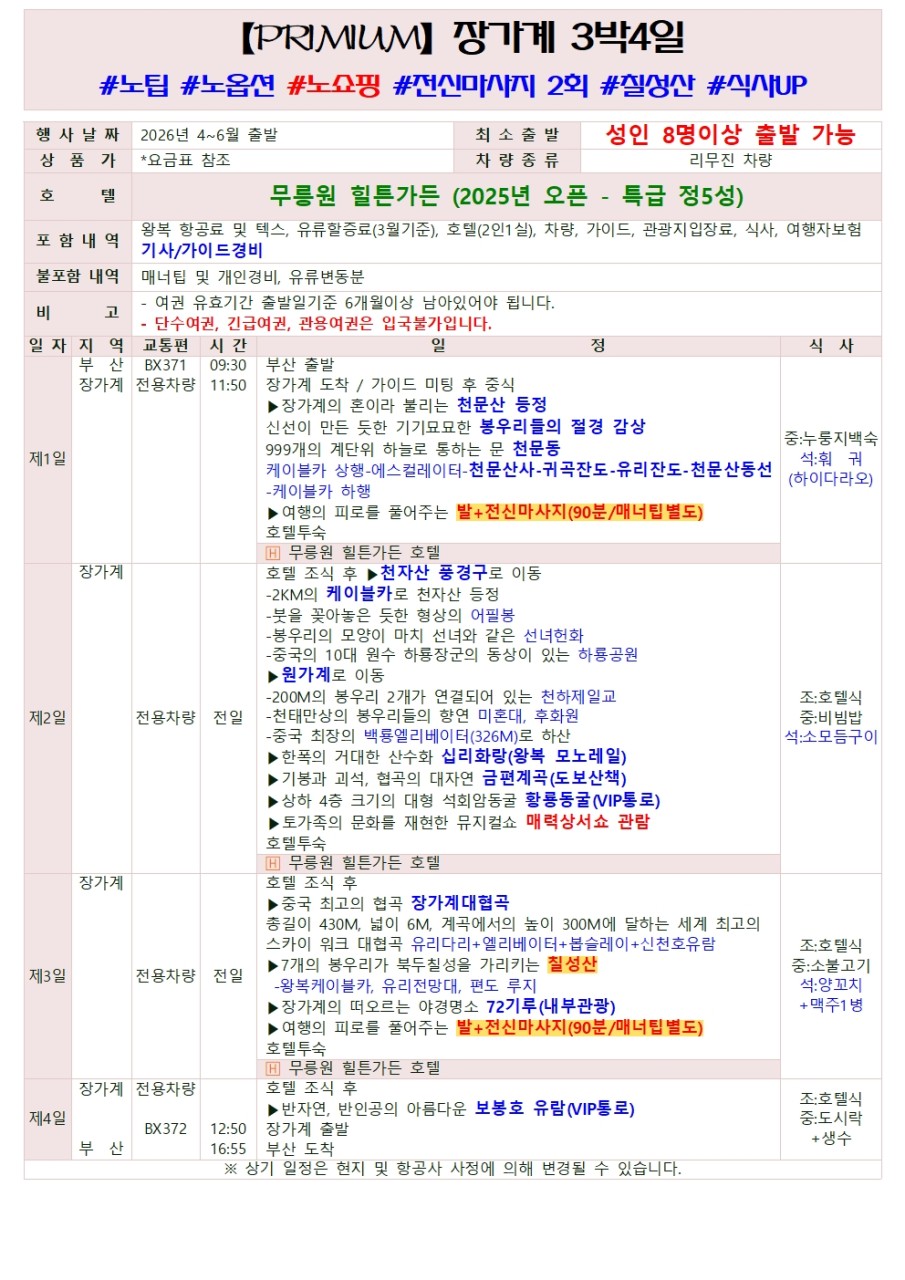 | 📌 상품 포인트 ✅ 노팁/ 노옵션/ 노쇼핑으로 현지에서 전혀 금액적 부담없는 프리미엄 상품 . ✅ 전일정 정5성 무릉원 힐튼가든 호텔 - 2025년 오픈!! ✅ 천문산필수코스 - 천문산사, 귀곡잔도, 유리잔도 ✅ 천자산 풍경구 - 케이블카 이용 ✅ 아바타속 풍경 원가계 - 천하제일교, 미혼대, 후화원, 백룡 엘리베이터 ✅ 십리화랑 - 왕복모노레일 ✅ 금편계곡 - 도보산책 ✅ 거대한 호수 보봉호 유람 - VIP통로 이용 ✅ 압도적크기의 황룡동굴 - VIP통로 이용 ✅ 발+전신맛사지 2회 ( 약 90분/ 팁별도) ✅ 북두칠성을 가리키는 칠성산 - 왕복케이블카, 유리전망대, 루지(편도) ✅ 스카이워크 대협곡 -유리다리+엘리베이터+봅슬레이+신천호유람 ✅ 장가계의 떠오르는 야경 명소 72기루 (내부관광) ✅ 소수민족의 이야기가 담긴 뮤지컬 매력상서쇼 관람 ✅ 특식 3회 - 훠궈, 소모듬구이, 양꼬치+맥주1병 ✅ 가이드 및 기사팁 포함 |