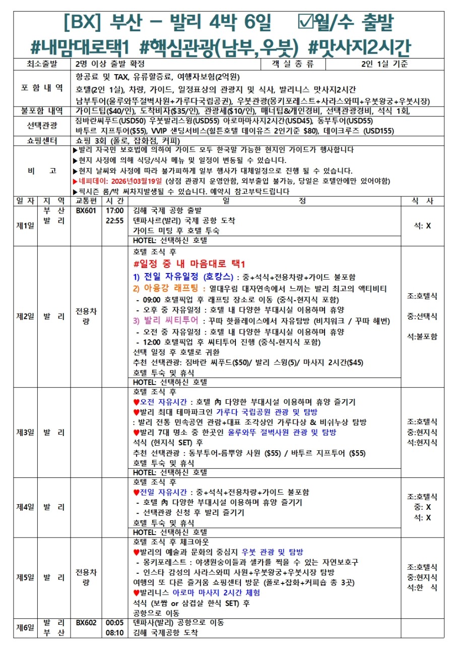 | ⭕ 포함사항 왕복 항공권, 유류할증료 및 택스, 숙소, 전일정 차량, 일정표상 식사, 맛사지 2시간, 남부투어(울루와뚜절벽사원+가루다국립공원), 우붓관광(몽키프레스트+사라스와띠+우붓왕궁+우붓시장), 1억원 여행자보험 ❌불포함사항 가이드 및 기사팁 ( 5일 $30/인, 6일 $40/일), 석식 1회, 도착비자 $35/인 + 관광세$10/인, 선택관광, 에티켓 팁 및 기타 개인 경비 |