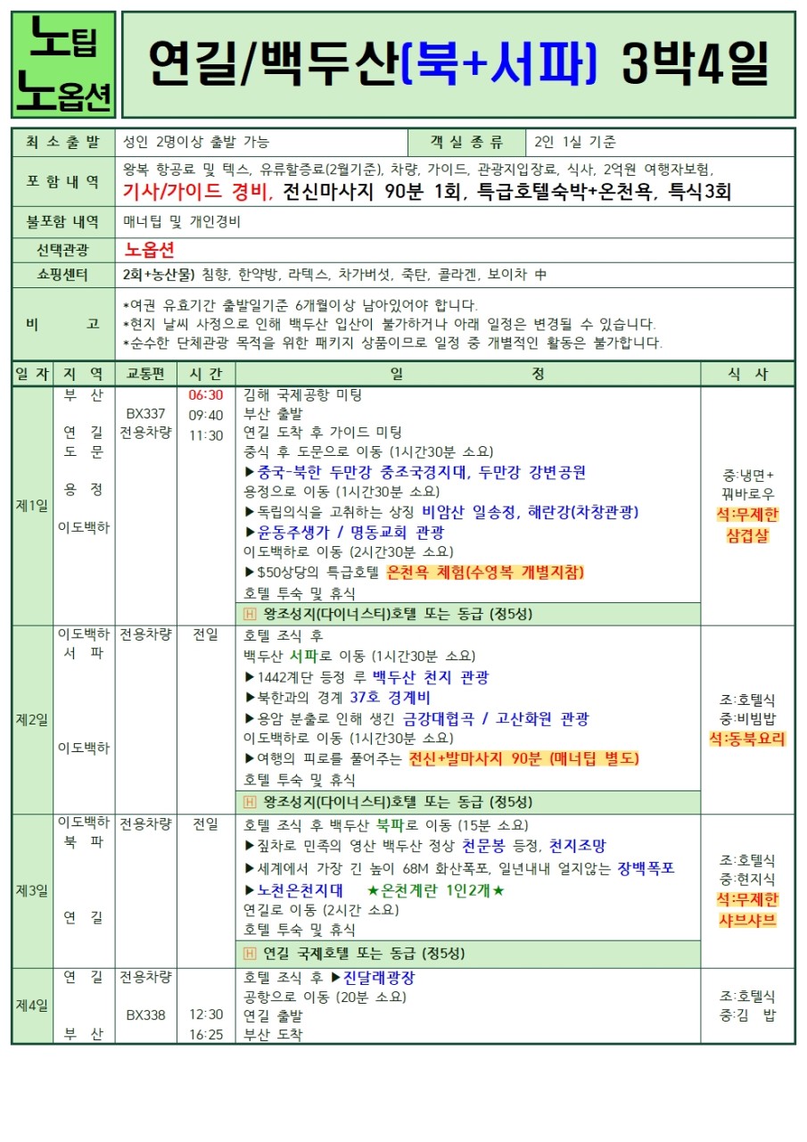 | 📌 상품 포인트 ✅ 노팁 노옵션 으로 현지에서 부담을 줄이세요 ✅ 특급온천 호텔 숙박 및 정 5성 호텔 숙박 ✅ 북파코스 - 차량이동으로 편하게 천지를 만나는 대표코스 ✅ $50상당의 특급호텔 온천욕 체험 ( 수영복 개별지참) ✅ 노천 온천지대에서 온천계란 1인 2개 제공 ✅ 발+전신 맛사지 90분 ( 매너팁 필수) - 여행의 피로를 풀어보세요 ✅ 특식 3회 제공 ( 삼겹살 무제한, 동북요리, 샤브샤브 무제한) |