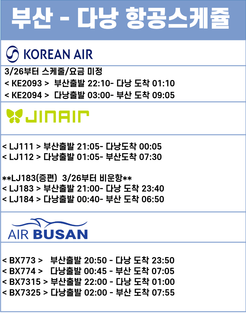 출발시간 부산 출발 20:50 - 다낭 도착 23:50(편수에따라 시간변동가능)