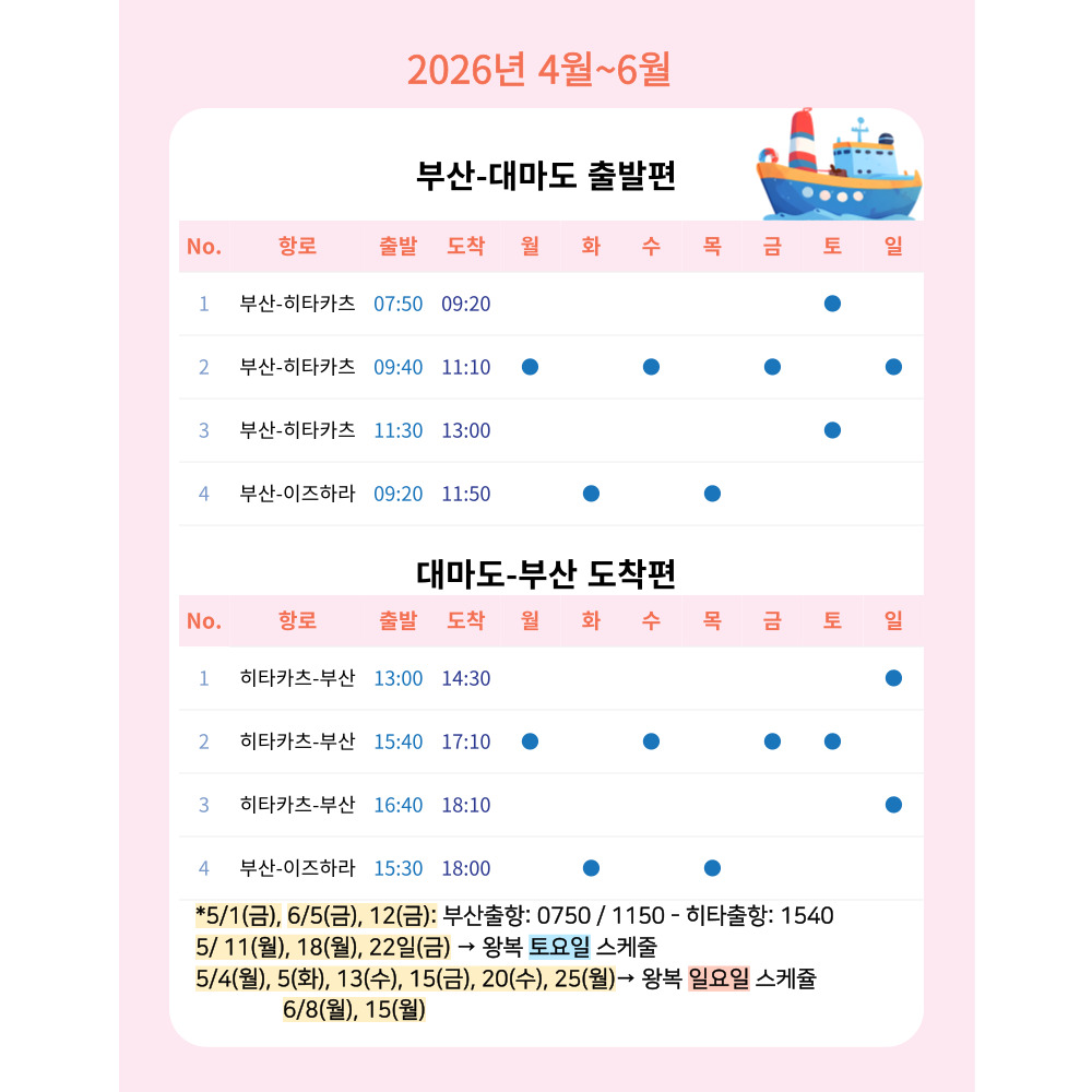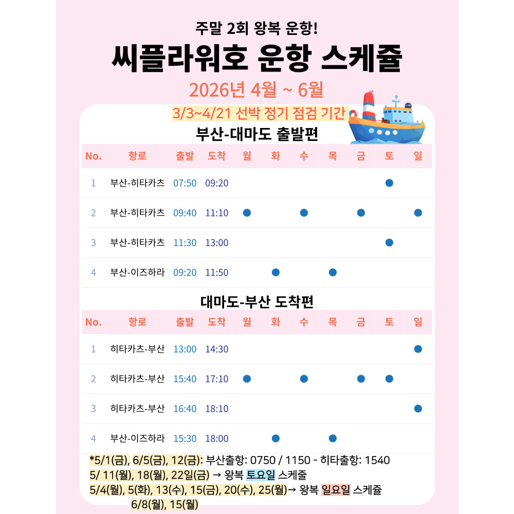 씨플라워호 승선권 | 2026년 4~6월 주말 대마도 배편 왕복 승선권 부산 출발 대마도 히타카츠 이즈하라 당일치기 1박 2일 복제 복제SALEBEST