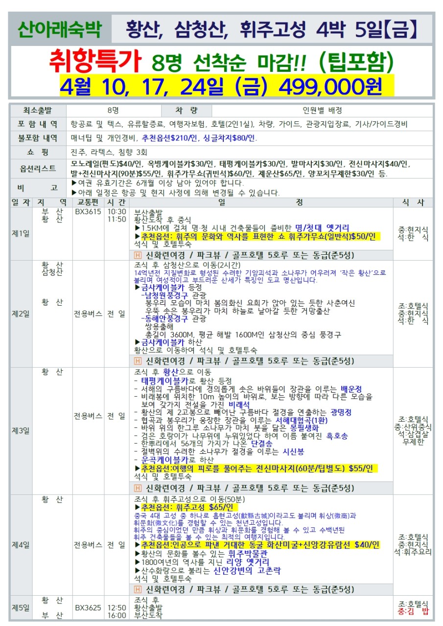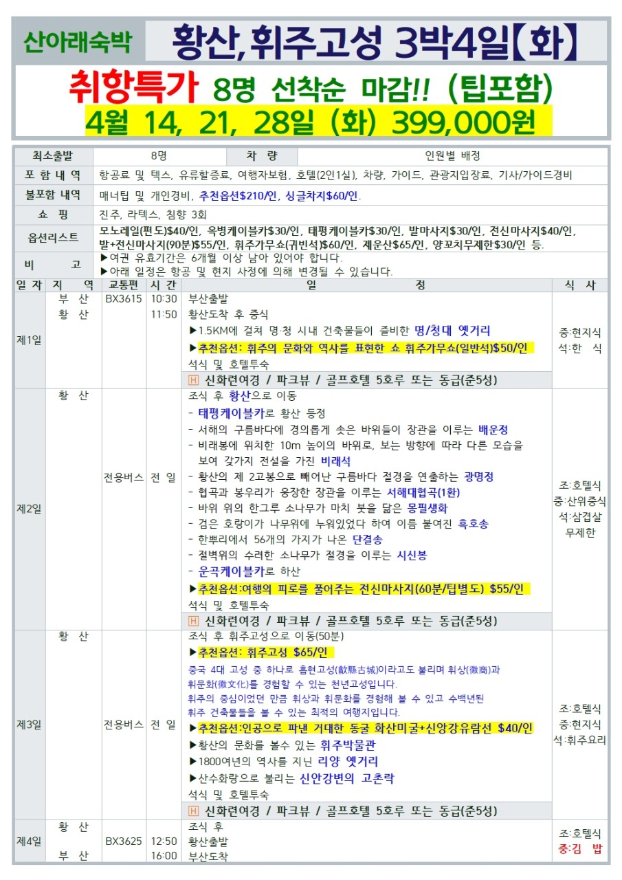 부산출발 -에어부산 황산/휘주고성 4일 ,5일 #취항특가 #선착순마감# 산아래숙박